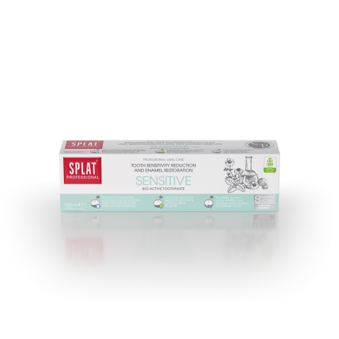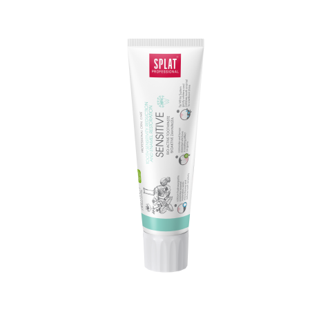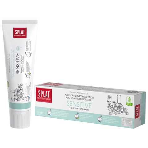 Etkili güçlendirici diş macunu, mineral kaybını telafi eder ve diş hassasiyetini azaltır. SPLAT SENSITIVE, mineyi yenileyen ve onun üzerinde olan mikro çatlakları "dolgu" gibi kapatayan aynı zamanda güçlendirici olan hidroksiapatiti içerir.